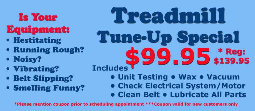 We are a treadmill & exercise and fitness repair company, exclusively. We only fix exercise & fitness equipment. We will fix your proform or nordictrack or any make, brand and/or model whether it be in your home, office, gym.....wherever. Treadmills, fitness bikes, ellipticals & home-gym universals, rowing machines. We are now giving 25% off treadmill repairs and treadmill service or tune-up and treadmill maintenance. We have SAME DAY service- Fast. We will fix & repair and service your broken down treadmill ,etc.
